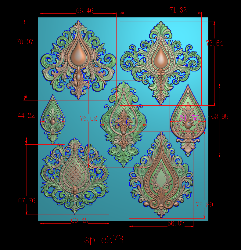 Top long onlay (second from right): W:13.3cm (5.24”) H: 5.2cm (2”)