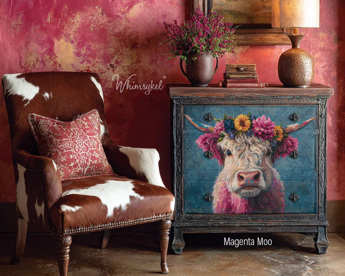 As part of the Wild Chapters collection, Magenta Moo brings playful personality, rich color, and statement-making energy to furniture makeovers, accent pieces, and mixed-media projects. She is made for creators who are not afraid of color, ideal for dressers, side tables, trays, and any piece that needs a little more life in the room. If your style runs toward whimsical, eclectic, or maximalist, this design was made for you.